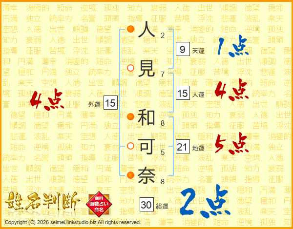 人(2画)見(7画) 和(8画)可(5画)奈(8画)