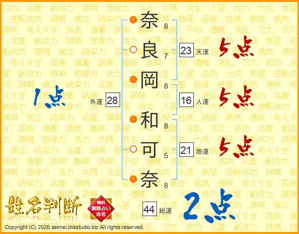 奈(8画)良(7画)岡(8画) 和(8画)可(5画)奈(8画)