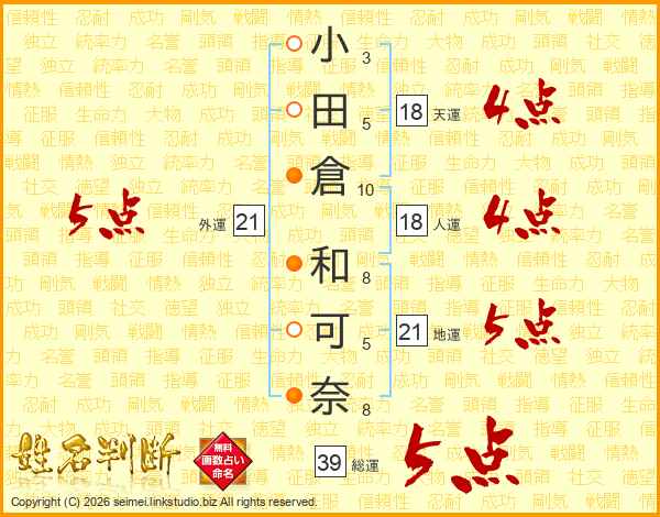 小(3画)田(5画)倉(10画) 和(8画)可(5画)奈(8画)
