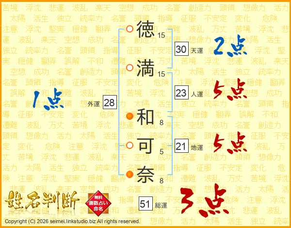徳(15画)満(15画) 和(8画)可(5画)奈(8画)