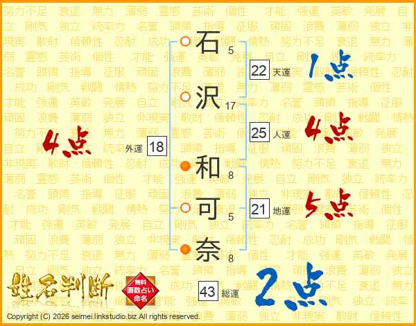 石(5画)沢(17画) 和(8画)可(5画)奈(8画)
