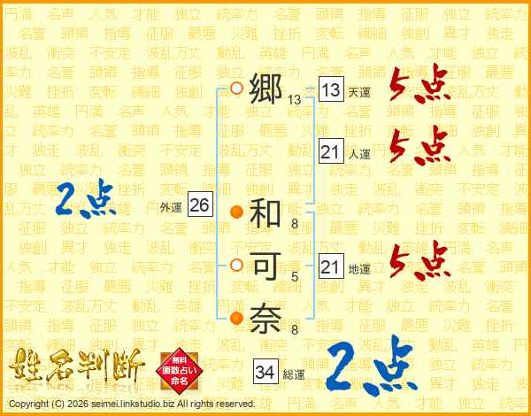 生活面を象徴する運勢です。外部から受ける影響力を表し、結婚運、家庭運や職場、環境への順応性を表します。総運から人運を引いた画数。姓や名が1文字の場合を除く。