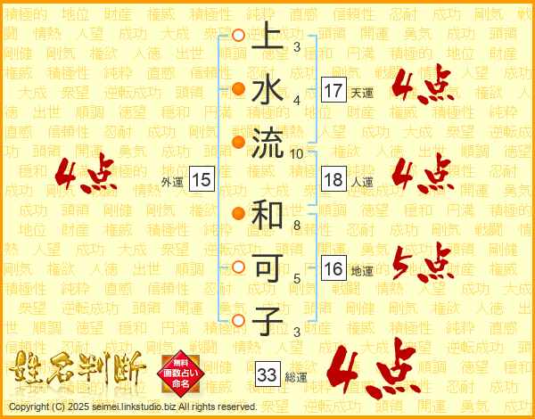 上(3画)水(4画)流(10画) 和(8画)可(5画)子(3画)