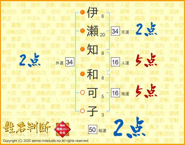 伊(6画)瀬(20画)知(8画) 和(8画)可(5画)子(3画)