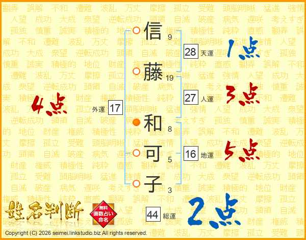 信(9画)藤(19画) 和(8画)可(5画)子(3画)