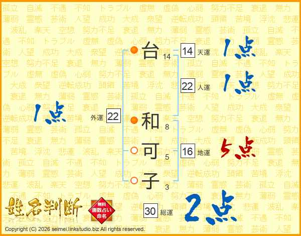 生活面を象徴する運勢です。外部から受ける影響力を表し、結婚運、家庭運や職場、環境への順応性を表します。総運から人運を引いた画数。姓や名が1文字の場合を除く。