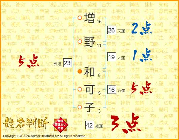 増(15画)野(11画) 和(8画)可(5画)子(3画)