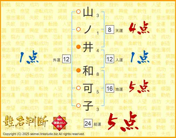 山(3画)ノ(1画)井(4画) 和(8画)可(5画)子(3画)
