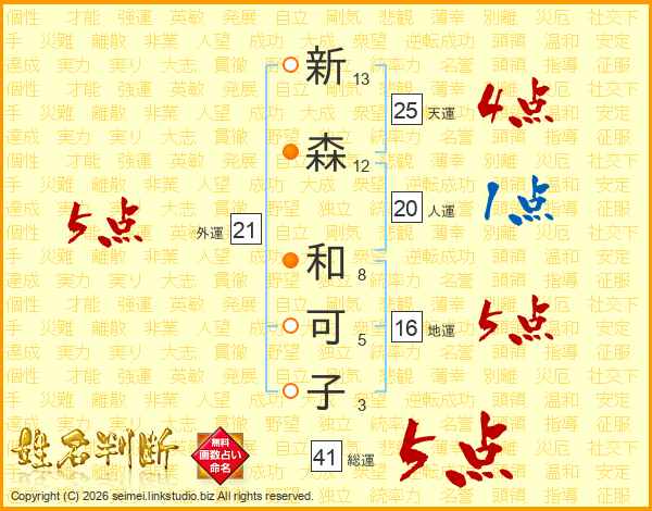 新(13画)森(12画) 和(8画)可(5画)子(3画)