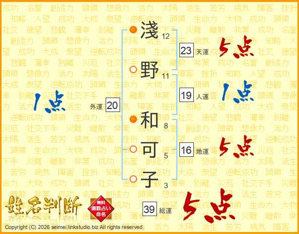 淺(12画)野(11画) 和(8画)可(5画)子(3画)