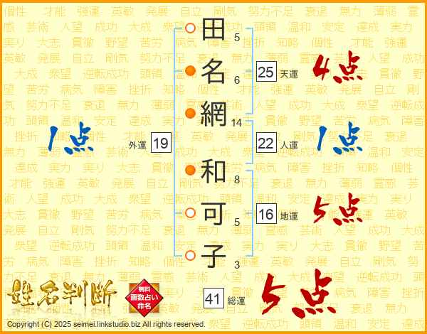 田(5画)名(6画)網(14画) 和(8画)可(5画)子(3画)