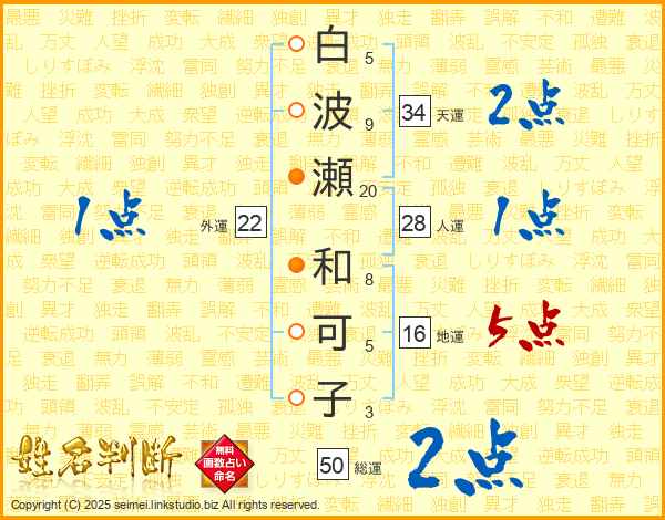 白(5画)波(9画)瀬(20画) 和(8画)可(5画)子(3画)