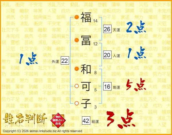 福(14画)冨(12画) 和(8画)可(5画)子(3画)