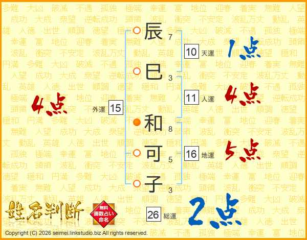 辰(7画)巳(3画) 和(8画)可(5画)子(3画)