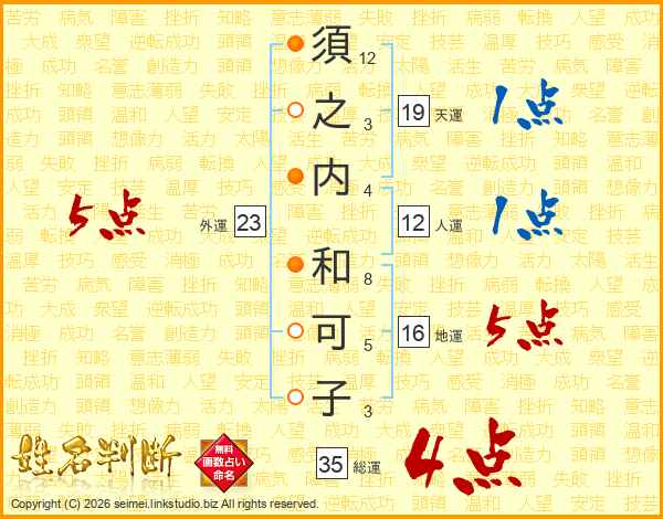 須(12画)之(3画)内(4画) 和(8画)可(5画)子(3画)