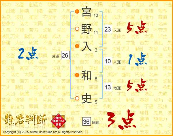 宮(10画)野(11画)入(2画) 和(8画)史(5画)