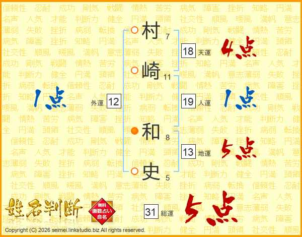 村(7画)崎(11画) 和(8画)史(5画)