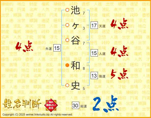 池(7画)ヶ(3画)谷(7画) 和(8画)史(5画)