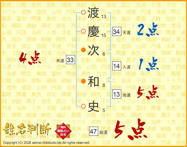 渡慶次和史さんの総運は47画の5点!