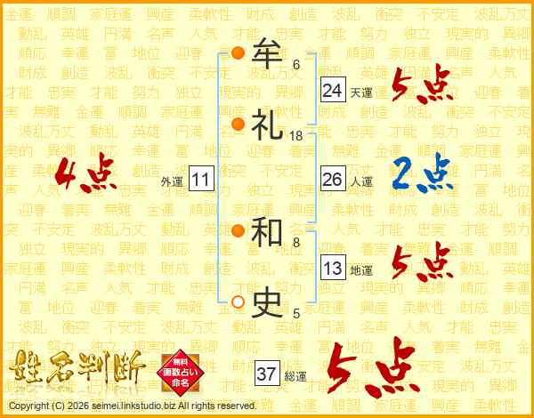 牟(6画)礼(18画) 和(8画)史(5画)