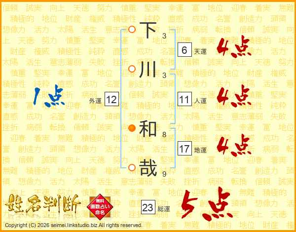 下川和哉さんの総運は23画の5点!