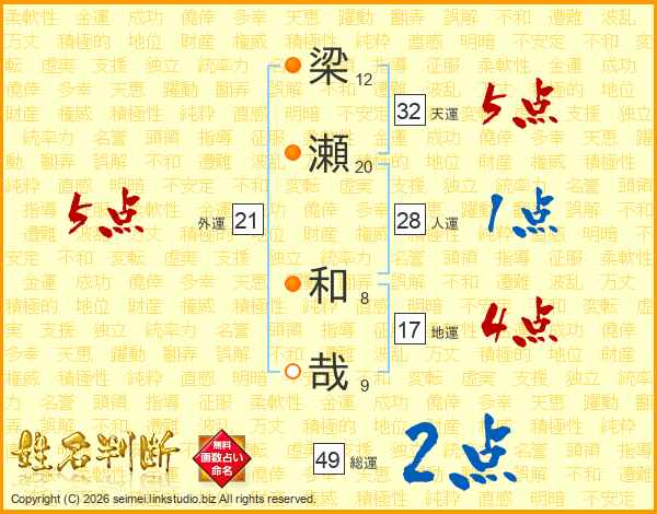 梁(12画)瀬(20画) 和(8画)哉(9画)