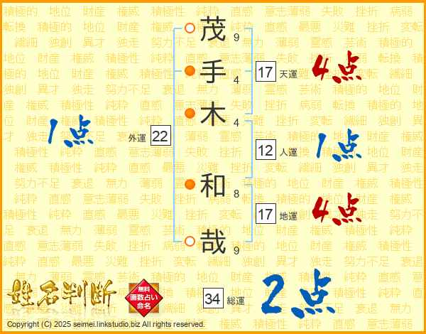 茂(9画)手(4画)木(4画) 和(8画)哉(9画)
