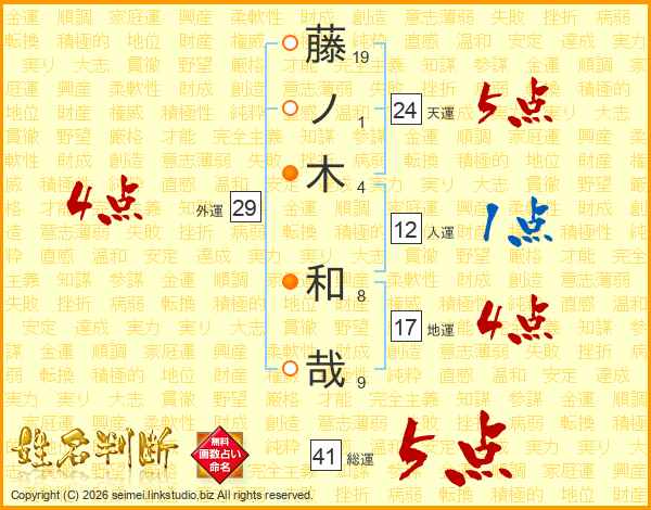 藤(19画)ノ(1画)木(4画) 和(8画)哉(9画)