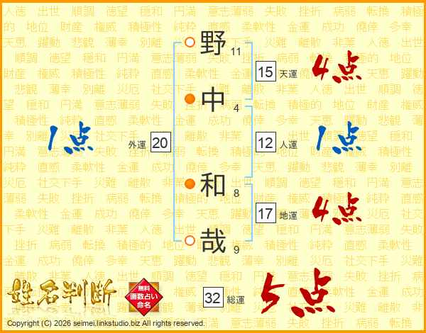 生活面を象徴する運勢です。外部から受ける影響力を表し、結婚運、家庭運や職場、環境への順応性を表します。総運から人運を引いた画数。姓や名が1文字の場合を除く。