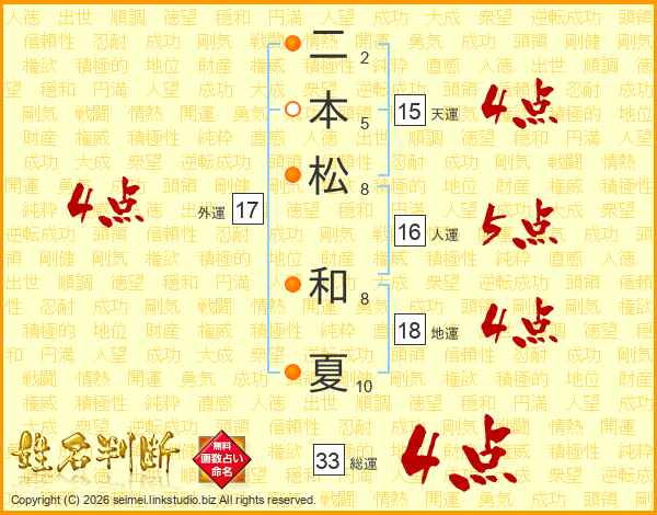 生活面を象徴する運勢です。外部から受ける影響力を表し、結婚運、家庭運や職場、環境への順応性を表します。総運から人運を引いた画数。姓や名が1文字の場合を除く。