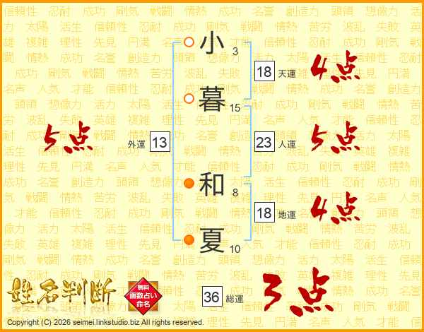 生活面を象徴する運勢です。外部から受ける影響力を表し、結婚運、家庭運や職場、環境への順応性を表します。総運から人運を引いた画数。姓や名が1文字の場合を除く。