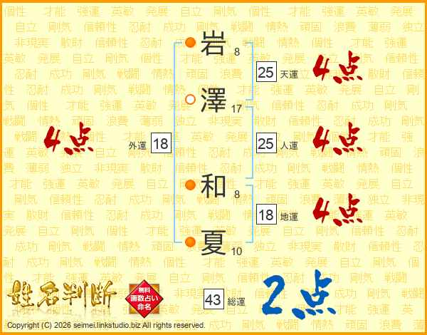 岩(8画)澤(17画) 和(8画)夏(10画)