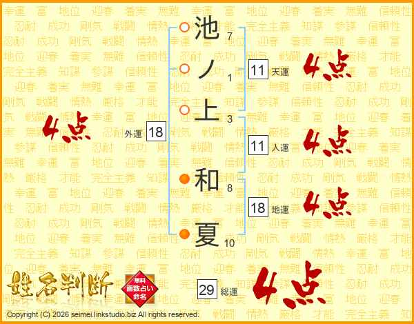 池(7画)ノ(1画)上(3画) 和(8画)夏(10画)