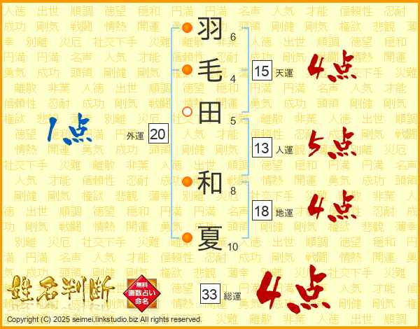 生活面を象徴する運勢です。外部から受ける影響力を表し、結婚運、家庭運や職場、環境への順応性を表します。総運から人運を引いた画数。姓や名が1文字の場合を除く。