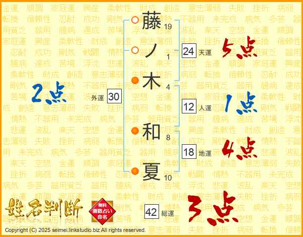 藤(19画)ノ(1画)木(4画) 和(8画)夏(10画)