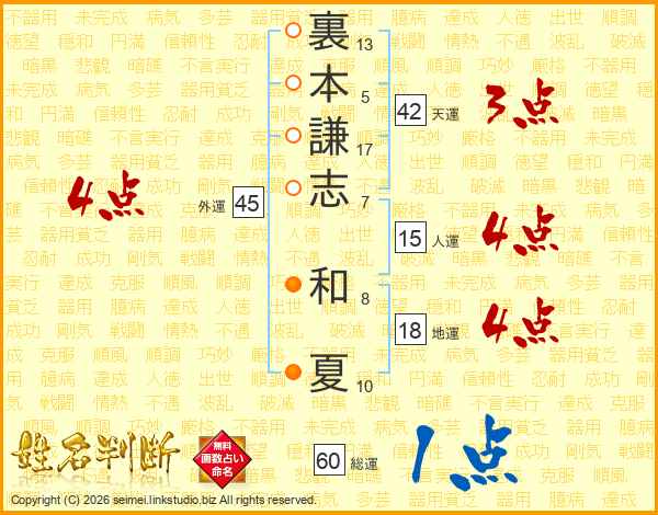 裏(13画)本(5画)謙(17画)志(7画) 和(8画)夏(10画)