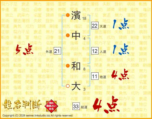生活面を象徴する運勢です。外部から受ける影響力を表し、結婚運、家庭運や職場、環境への順応性を表します。総運から人運を引いた画数。姓や名が1文字の場合を除く。