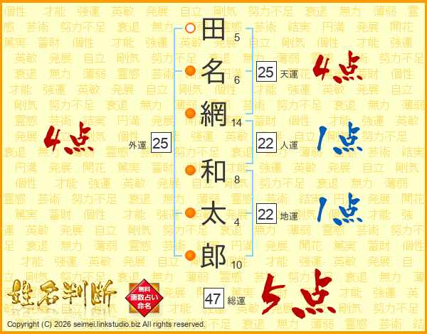 田(5画)名(6画)網(14画) 和(8画)太(4画)郎(10画)