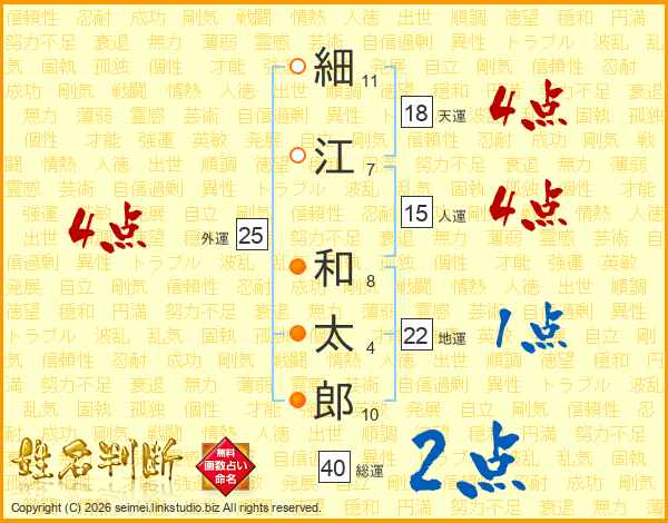 細(11画)江(7画) 和(8画)太(4画)郎(10画)