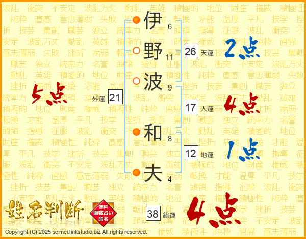 伊(6画)野(11画)波(9画) 和(8画)夫(4画)