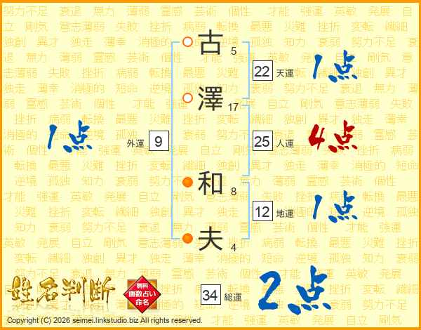生活面を象徴する運勢です。外部から受ける影響力を表し、結婚運、家庭運や職場、環境への順応性を表します。総運から人運を引いた画数。姓や名が1文字の場合を除く。