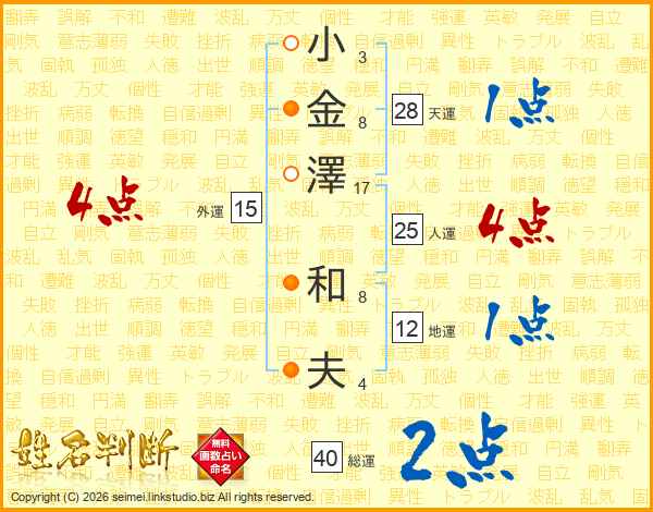 小(3画)金(8画)澤(17画) 和(8画)夫(4画)