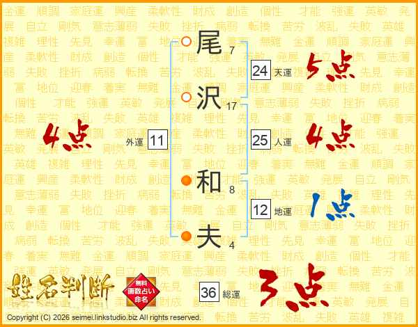 尾(7画)沢(17画) 和(8画)夫(4画)