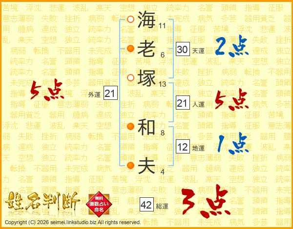 海(11画)老(6画)塚(13画) 和(8画)夫(4画)