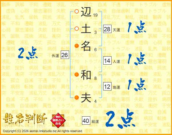 辺(19画)土(3画)名(6画) 和(8画)夫(4画)