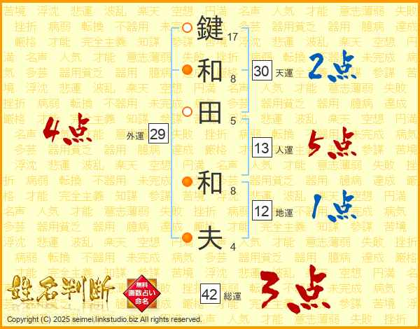 鍵(17画)和(8画)田(5画) 和(8画)夫(4画)