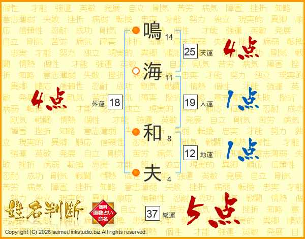 鳴(14画)海(11画) 和(8画)夫(4画)