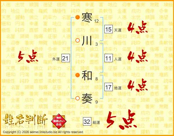 生活面を象徴する運勢です。外部から受ける影響力を表し、結婚運、家庭運や職場、環境への順応性を表します。総運から人運を引いた画数。姓や名が1文字の場合を除く。