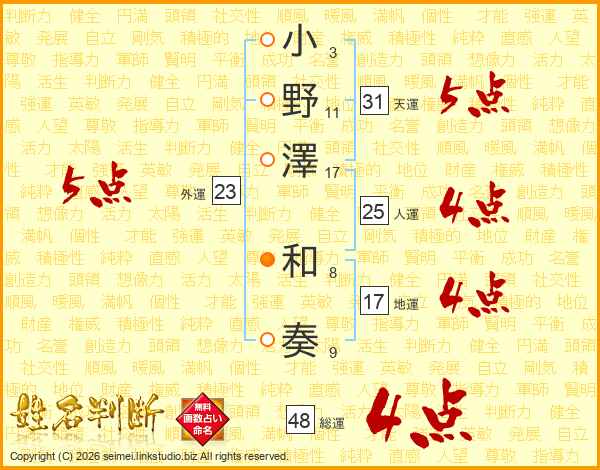 小(3画)野(11画)澤(17画) 和(8画)奏(9画)