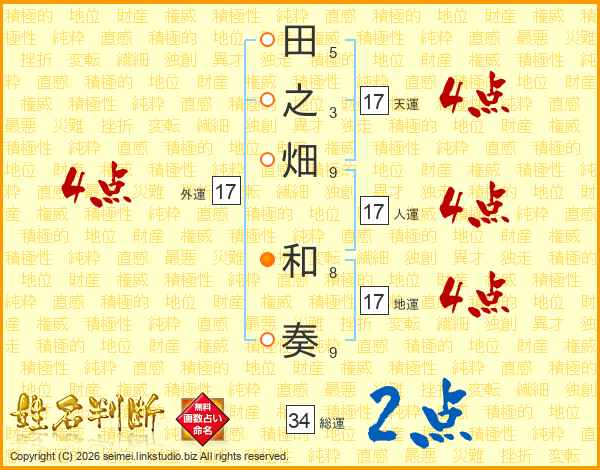 田(5画)之(3画)畑(9画) 和(8画)奏(9画)
